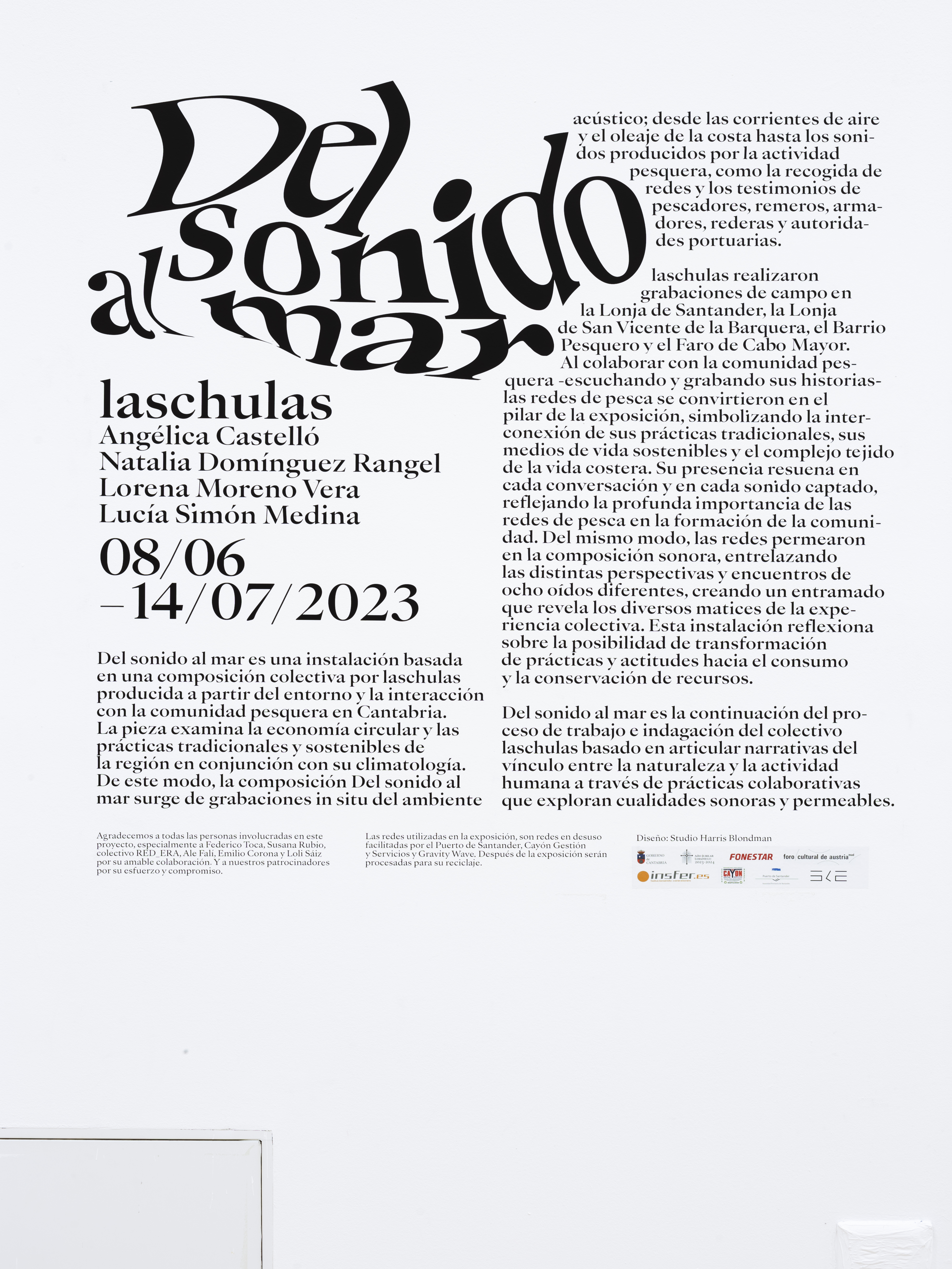 Del sonido al mar is an installation based on a collective composition by laschulas produced from the environment and interaction with the fishing community in Cantabria. The piece examines the circular economy and the traditional and sustainable practices of the region in conjunction with its climatology. In this way, the composition Del sonido al mar arises from in situ recordings of the acoustic landscape, from the air currents and waves of the coast to the sounds produced by fishing activity, such as the gathering of nets and the testimonies of fishermen, rowers, shipowners, net menders, and port authorities.